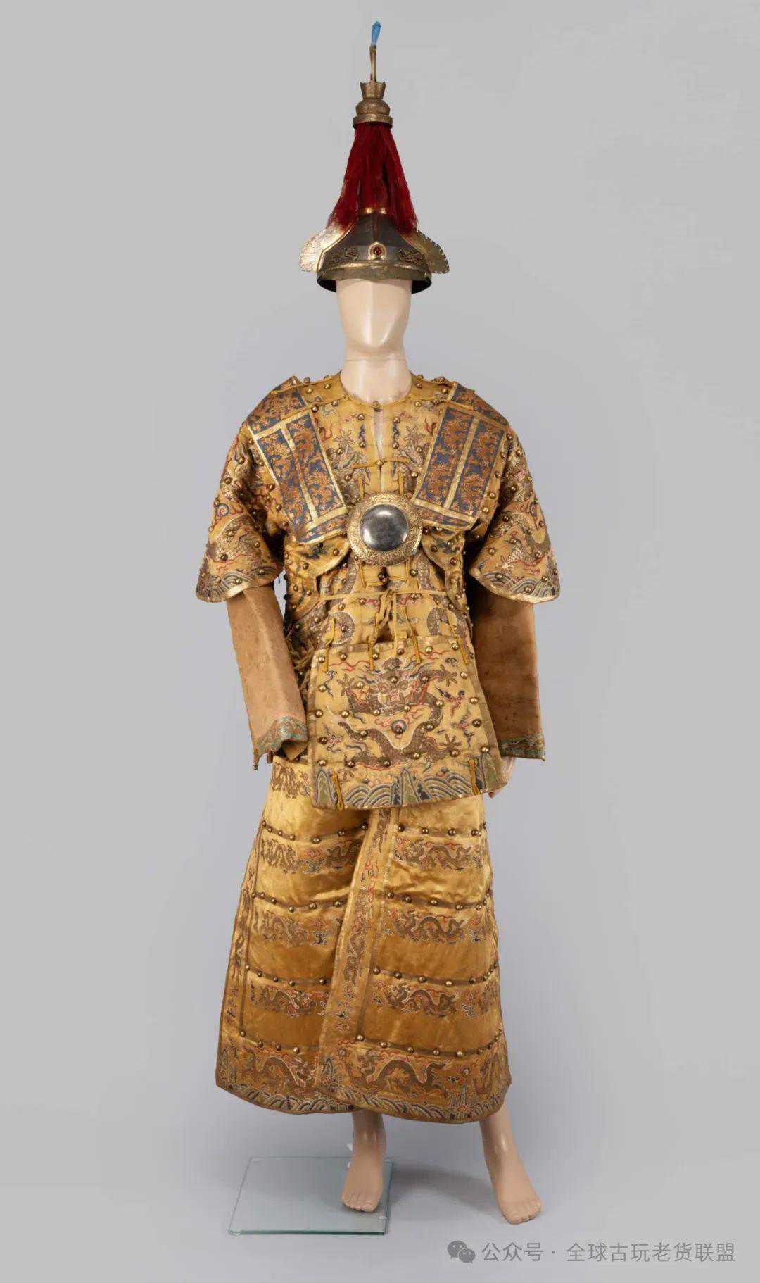清黄色缎绣镶嵌铜钉金龙纹铜盔棉甲