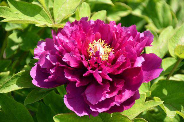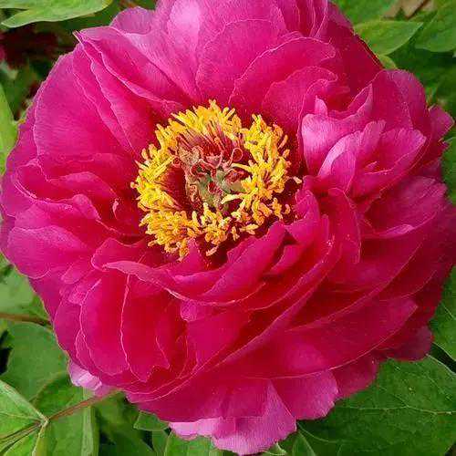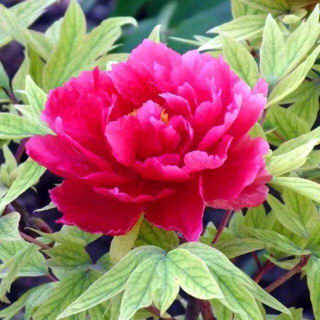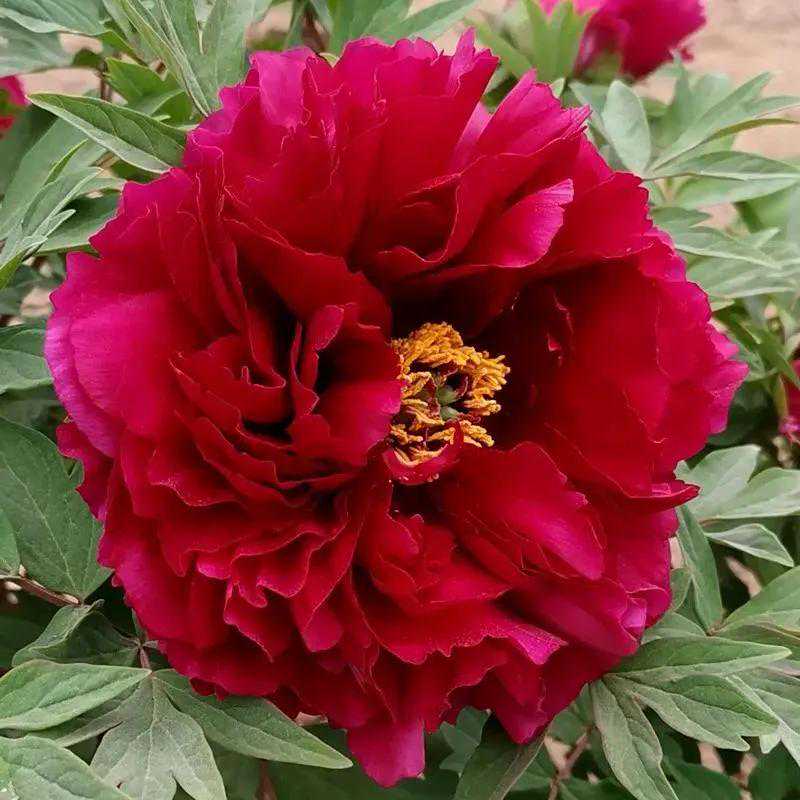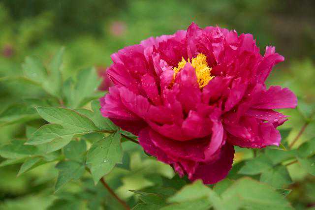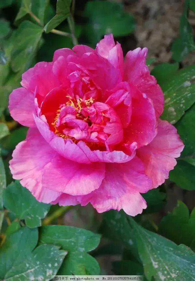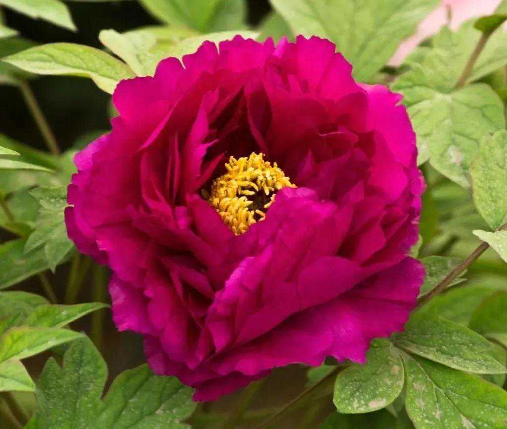 一朵深红色花瓣的牡丹花,颜色漂亮大气,黄色花蕊点缀其间,高贵典雅。