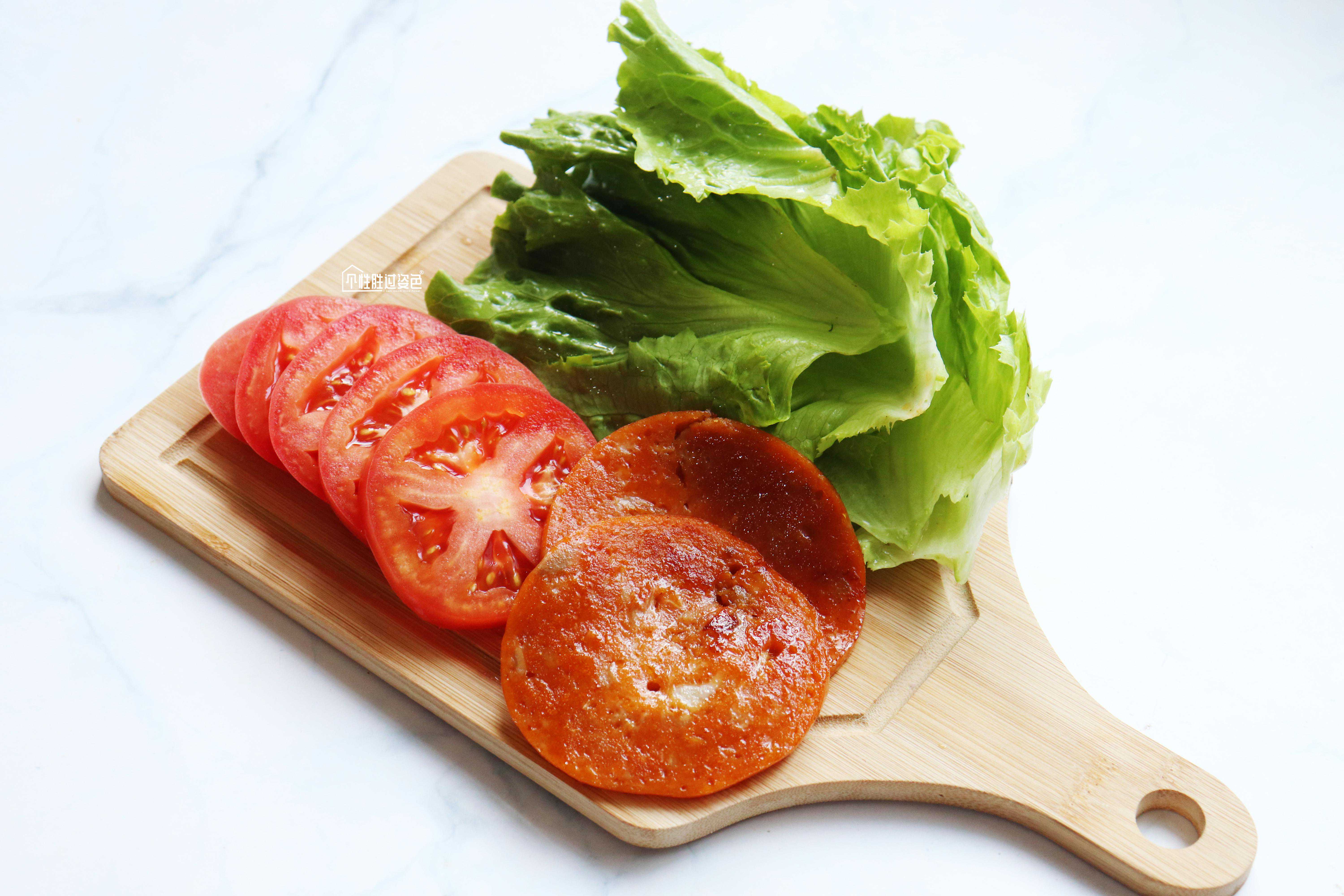 6.准备生菜、番茄和煎好的新奥尔良鸡胸肉饼