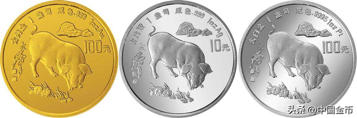 (右)为中国熊猫金币发行十周年1盎司金币,直径27毫米