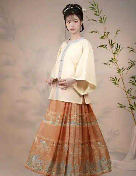 乍一眼看上去,马面裙和百迭裙十分相似,因为两者裙身上皆有不打褶的长方形区域,只不过马面裙上不打褶的区域叫裙门,在百迭裙那里叫做光面,这种不打褶的长方形区其实都叫做马面,但是为了区分百迭裙和马面裙分别用光面和裙门代替!