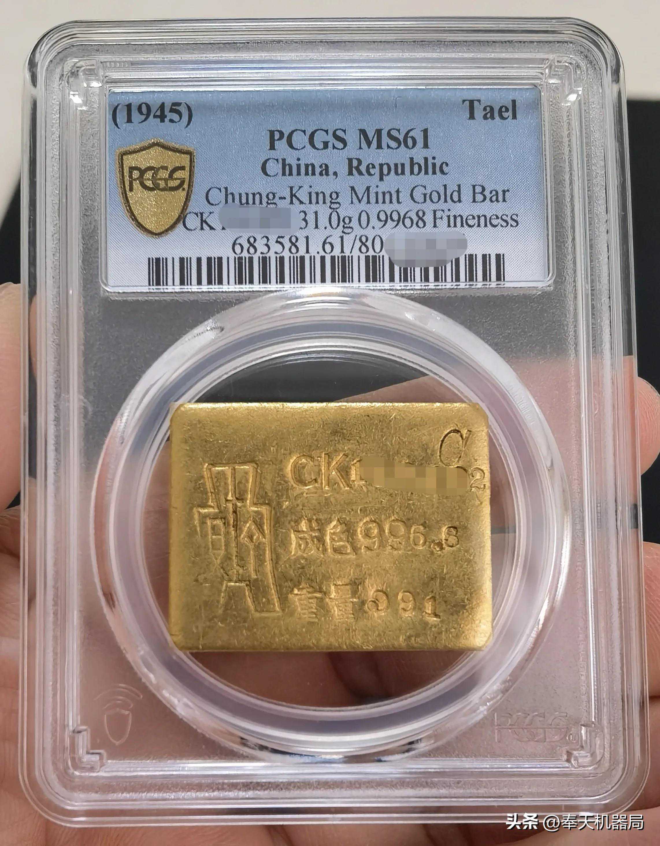 2021年左右PCGS评级公司开始接受厂条(民国中央造币厂官方生产的金条)评级业务,仍然采用国际最认可的谢尔登70评级标准,2023年6月底我决定把这枚厂条送PCGS评级,也想验证一下自己当初对品相的把控是否准确。送评时原打算走的310档,有泉友说现在民国三十四年的重庆造币厂厂条评级费310档不给评,于是直接走的560档。