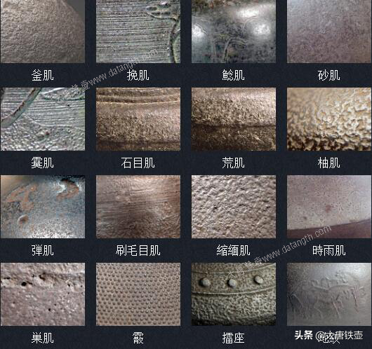 以壶身的肌理而名的铁壶,大致分为挽肌、霙肌、鲶肌、柚肌、弹肌、砂肌、荒肌、时雨肌、石目肌等。