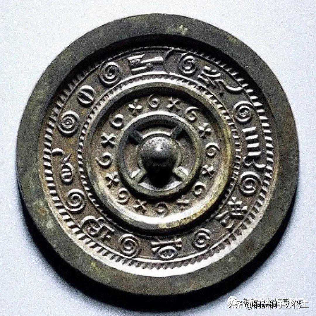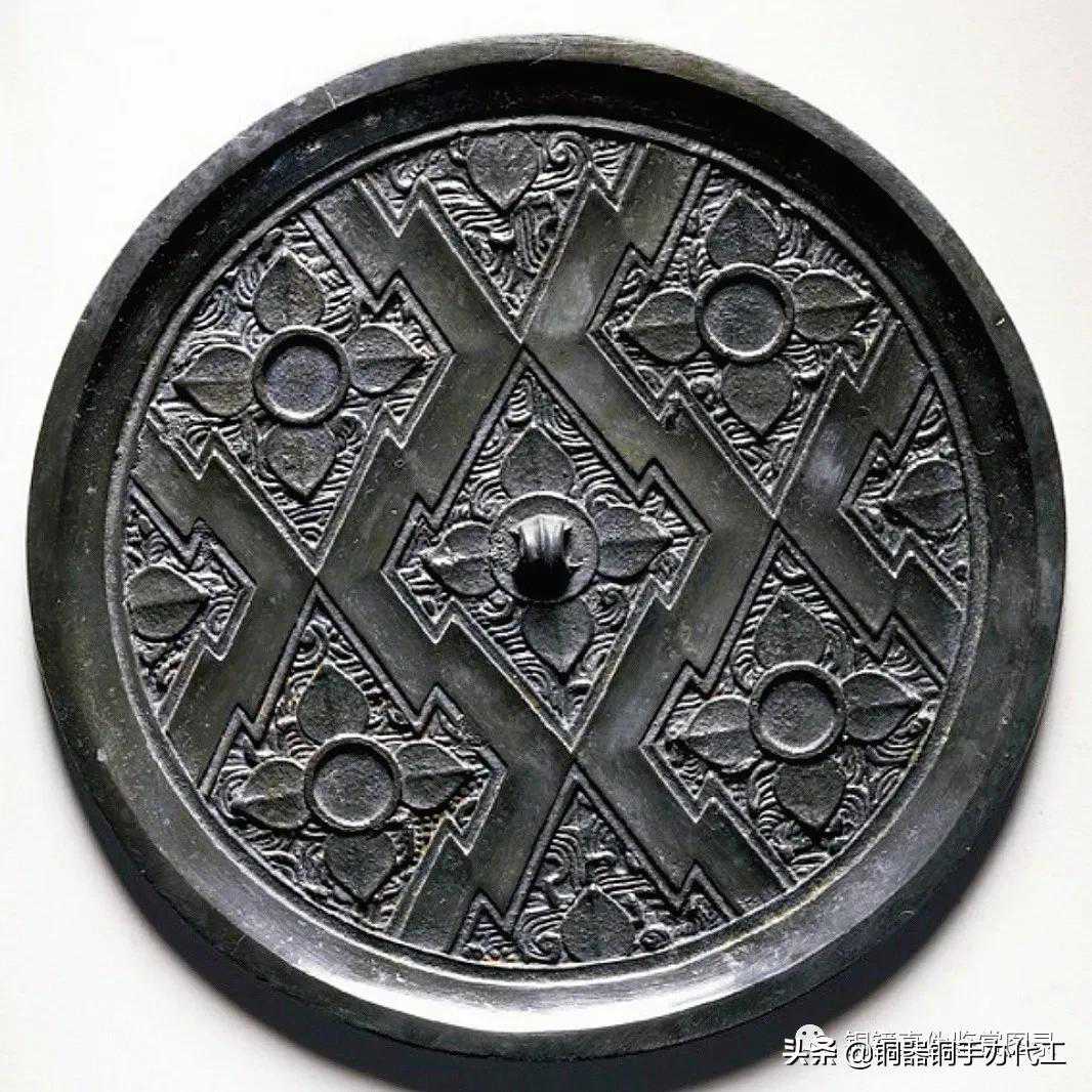 镜光气莹亮,打磨精细,钮外配饰内连弧纹环带,主纹饰为点线结合的几何纹。