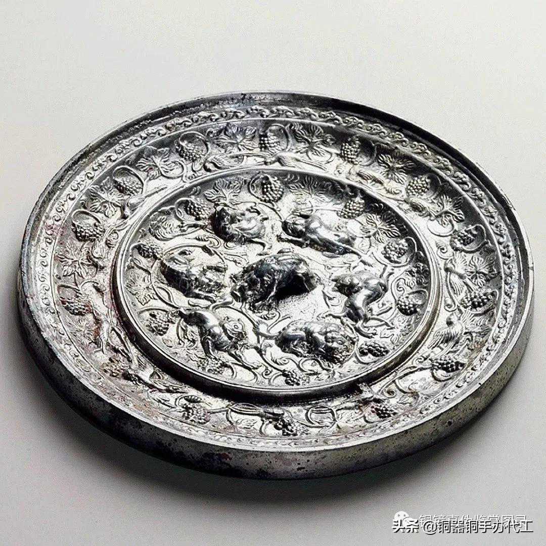镜光气匀亮,工艺细腻,品相极佳,保存完整。伏兽钮,凸起的联珠纹高圈将镜背纹饰分为内外两区,内区五只瑞兽环绕镜钮,五兽造型如狐似狼,有的回首顾盼,有的昂首阔步,形态各不相同,动态丰富,造型浑厚,生趣自然。其间饰葡萄纹及枝叶纹饰。枝叶纹相互穿插缠绕,形式优美。外区葡萄藤蔓与禽鸟相间分布,布局精细。