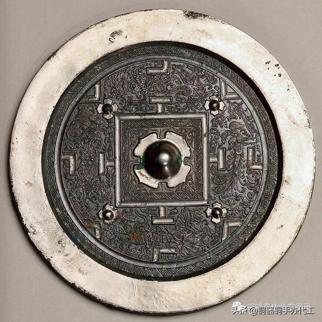 镜版工细致,三弦钮,满饰云雷底纹,浮雕三组变形勾连的凤鸟纹饰,工艺精湛,惜裂修。