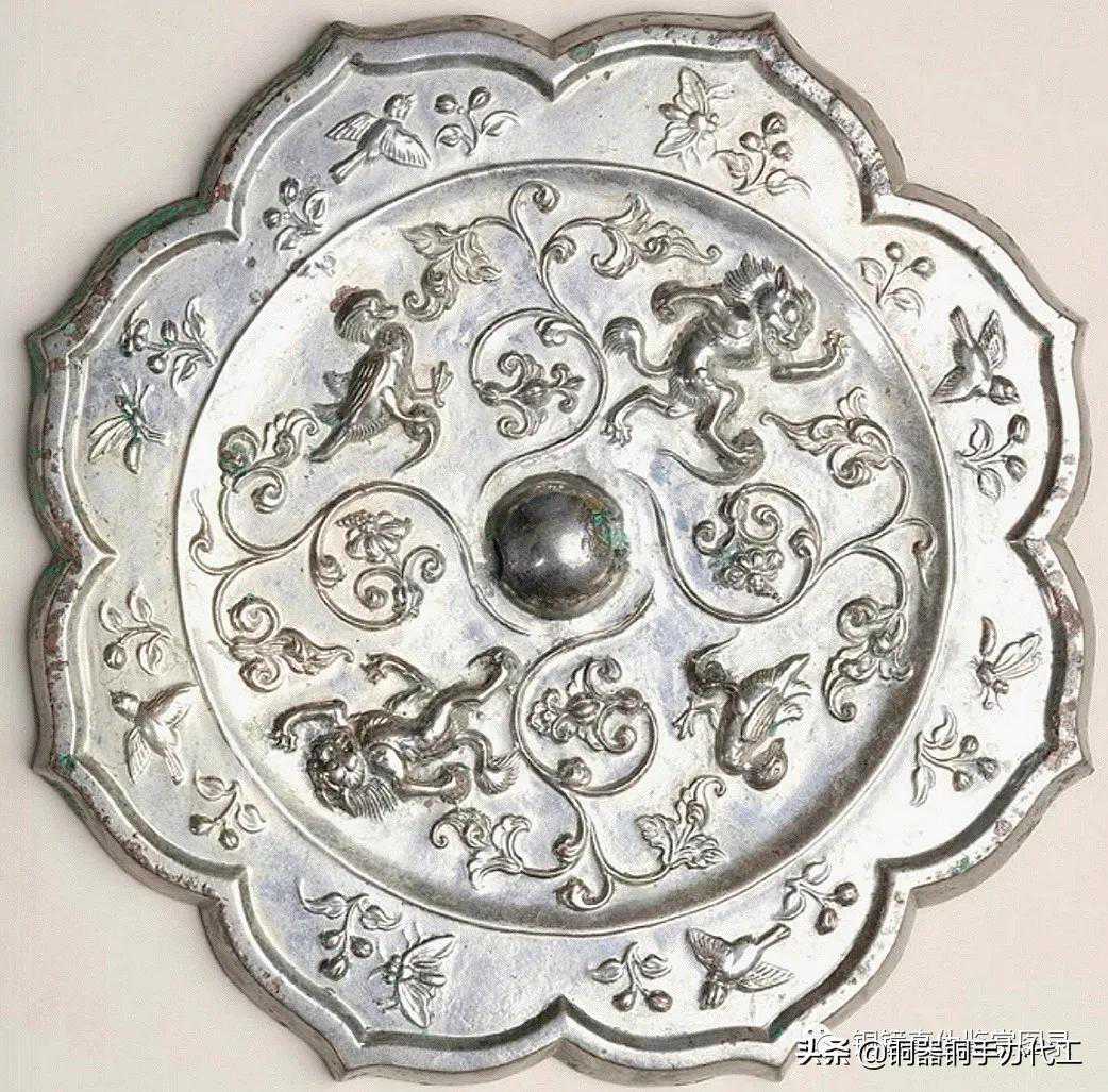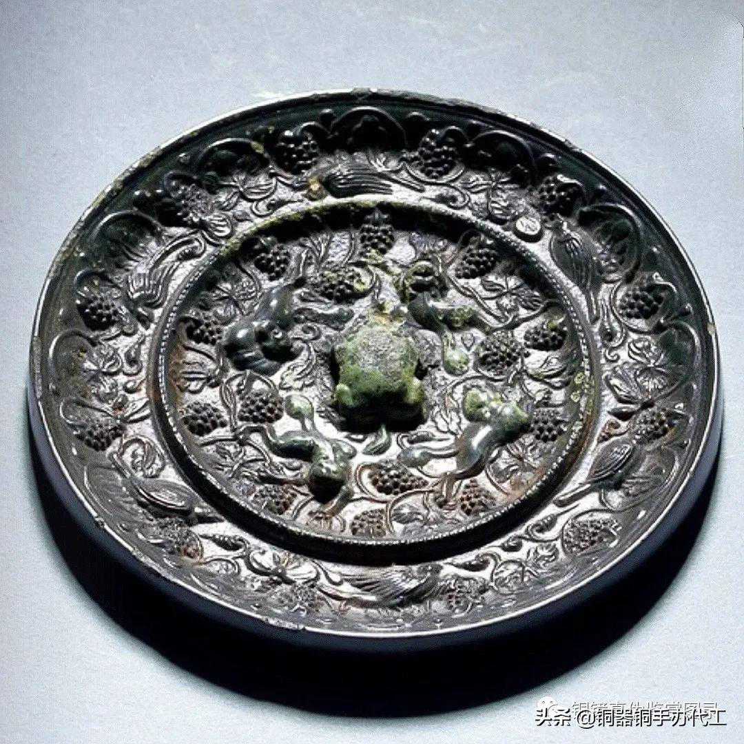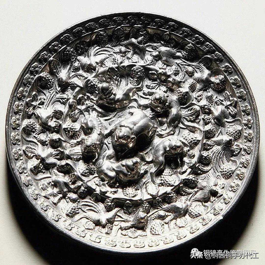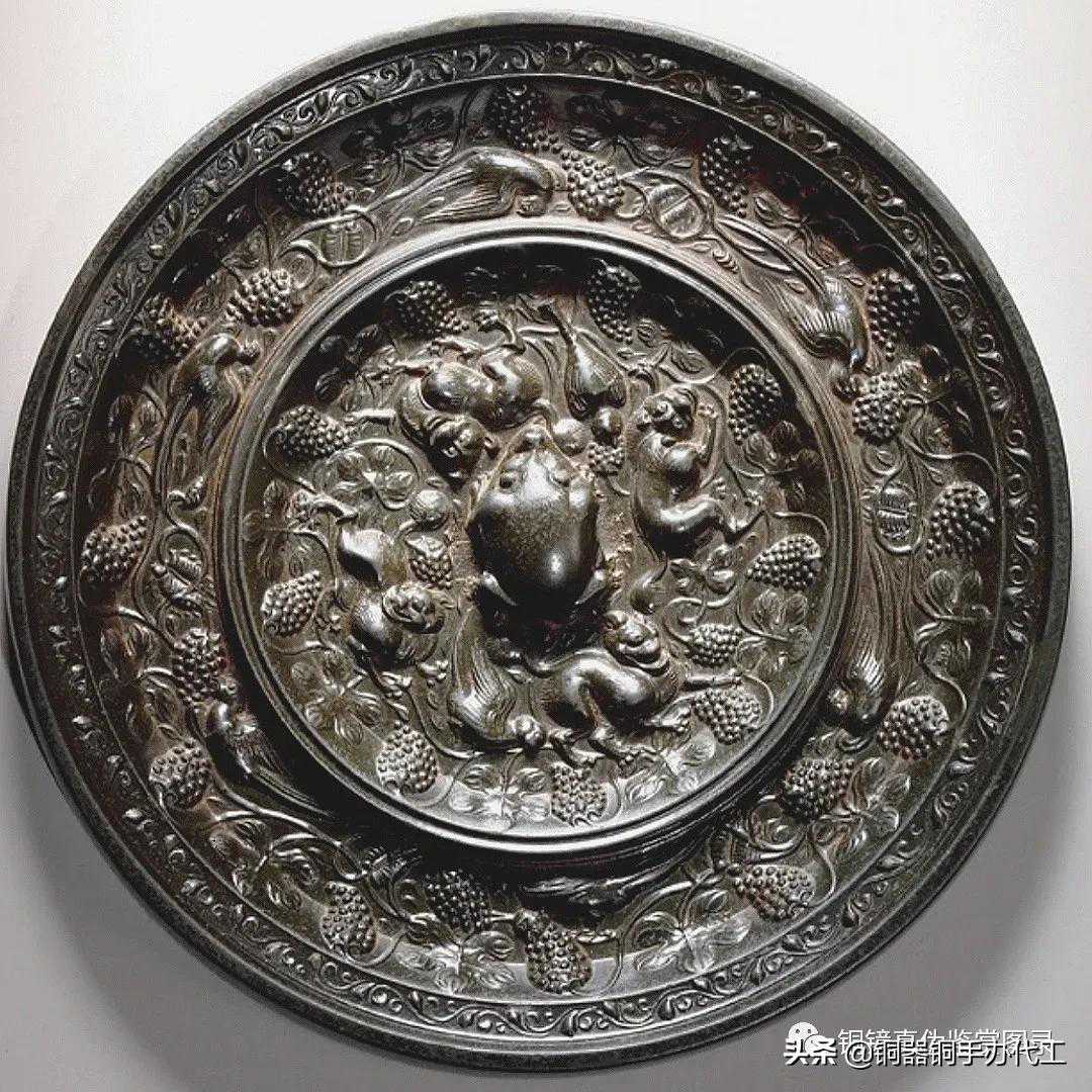 镜光气甚佳,尺寸大而厚重,有修。双弦纹高圈将镜背分为内外二区,内区高浮雕八只在葡萄叶蔓之间嬉戏的瑞兽,造型似狮,两两相对,环绕镜钮。瑞兽间饰以葡萄枝蔓。弦纹高圈内饰长短两周锯齿纹。外区饰瑞兽、鸾鸟和葡萄枝蔓相间环绕,镜缘处饰缠枝花卉纹。