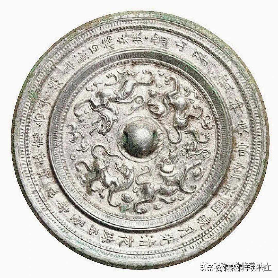 镜白光银亮,版工清晰,四龙体态丰盈,线条飘逸,兽面浮雕隆起,怒目巨口,神态非凡。