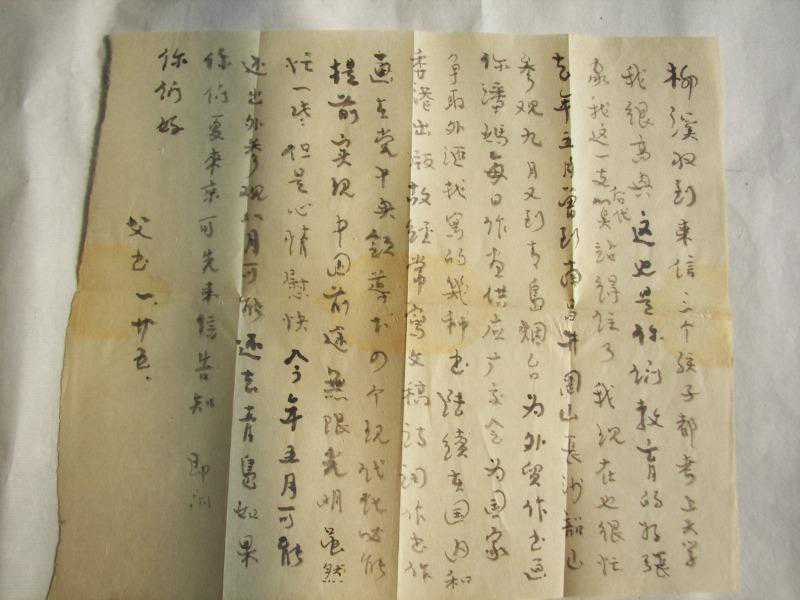 1979年暑假去北京,爸爸特意请假和我们一同去看爷爷。奶奶嘱咐我们,到了后海,不要把“文革”受牵连的事告诉他,他会难受的。果然爷爷见到我们,首先问的是“文革”中受了什么牵连,我只好说那都是以前的事了。爷爷说,那我们只谈高兴的事。他问了我们都学的什么专业及学校的一些情况。然后就带我们到莫斯科餐厅吃饭。饭后又去了北海后门的中国文史馆。我当时还很纳闷,去文史馆干什么?他让我们把考上的大学的名称、系、班级及详细地址都写出来,交给了文史馆负责人。爷爷告诉我们,要给每人开一份关于他的证明,寄到学校去。看着爷爷这股认真劲,看到为了我们的前途,八十来岁的爷爷拄着拐棍走这么远路,我的眼泪直打转。爷爷的心里一直有我们,他一直把我们的前途和命运挂在心上。