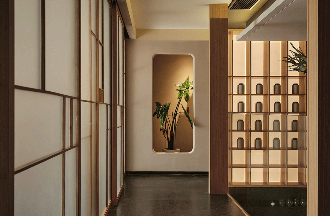 有关灯光:在解决自然光的同时,我们还需要防止天公不作美时,室内环境的不可控。因为高度我们减少了顶面点状光的表达,而是在人与人的区隔处理上使用了半透材质,赋予材质光的属性,以面光的形式塑造了空间和空间中的人。“珀”在无光的环境中就是石头一枚,正是有了光它的韵味才得以体现。