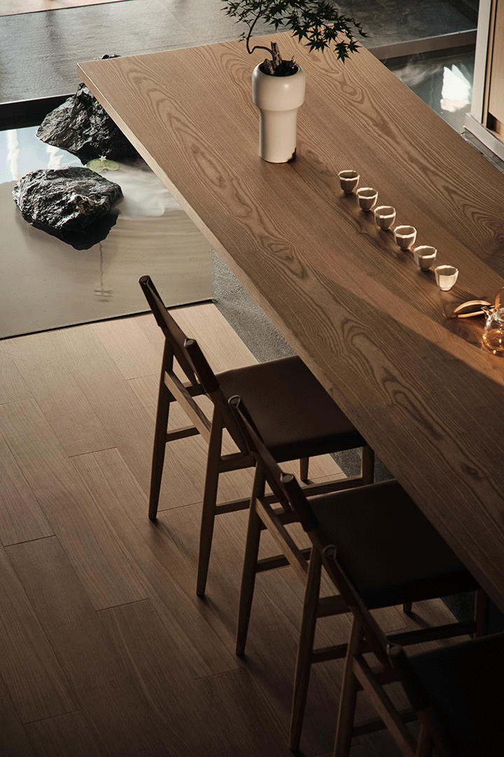中心挑空也形成了两层半环廊式的动线特征。行进中人的视线不会因低矮的层高而感到压抑。中心开阔的空间释放了高度不足带来的压迫。也分割出不同的消费组团和功能区间。所有消费者都绕不开这个开阔的空间,这里设定为调茶师的秀台,如同酒吧调酒师的吧台一样,让茶气味,韵味和茶的文化缭绕在整个空间。