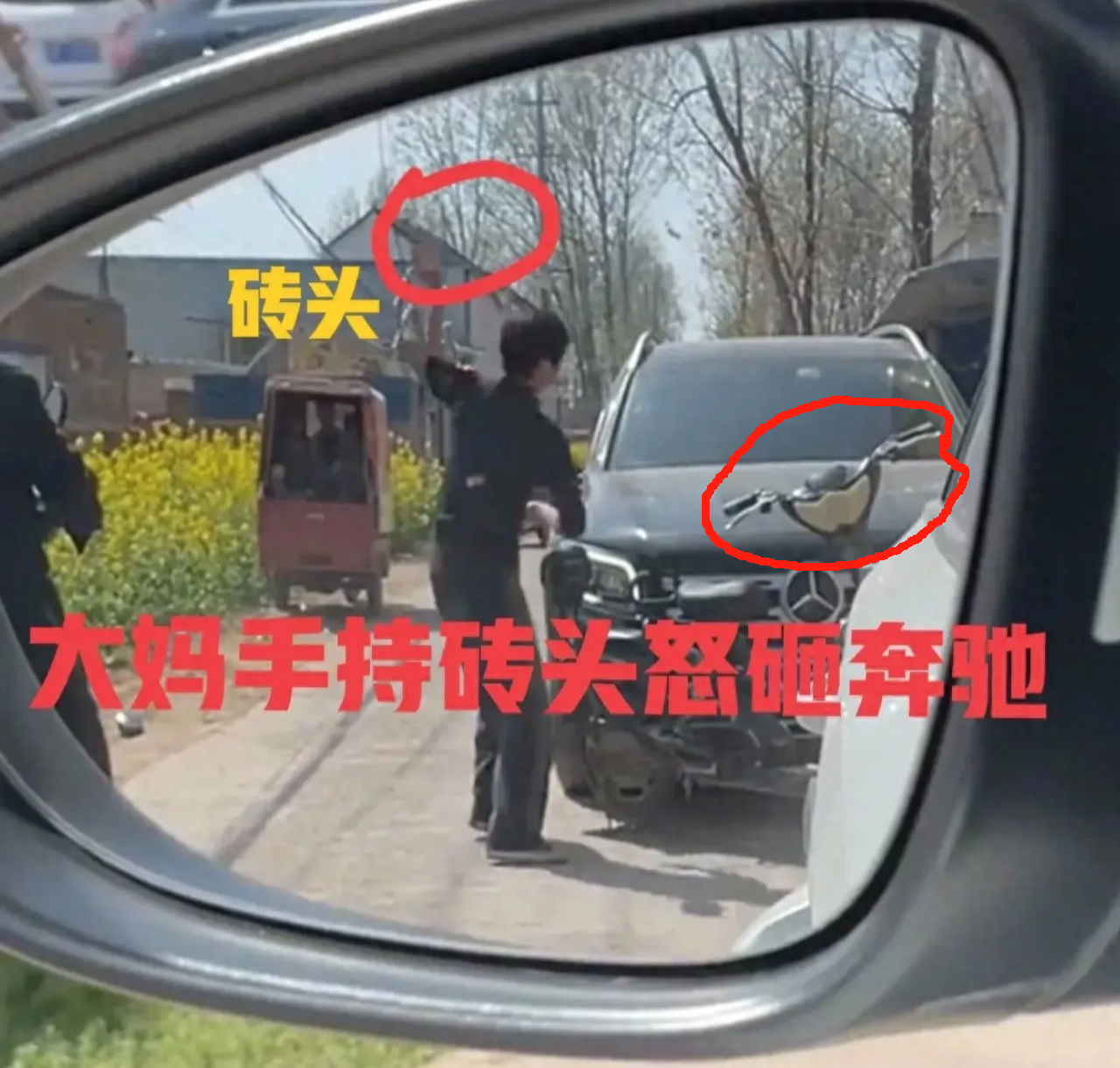 突然,大妈目光一凝,眼前一亮,迅速到路边操起块砖头就砸了起来,这下有了趁手的武器,后视镜再也撑不住了,没几下就被砸得“露骨”,面目全非。
