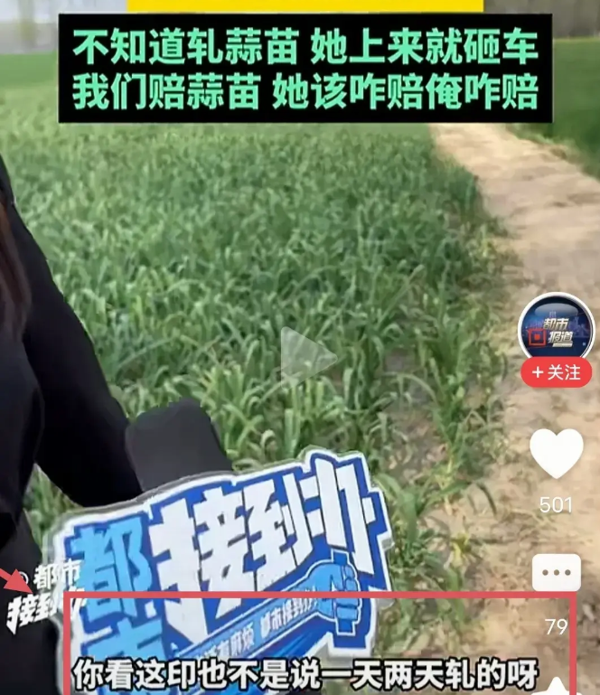 当她再回到事发地观看的时候,发现大妈的蒜苗地确实有被碾压的痕迹,但有的车辙已经明显可以看出不是最近几天的样子,并且碾压的车辆也不一定就是自己。