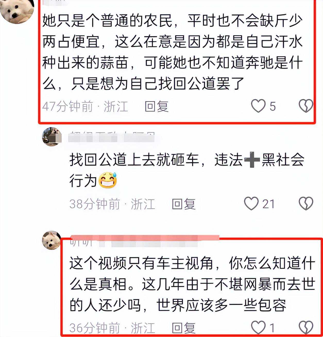 虽然网友基本上都站在车主王女士一边,但也有相当一部分人站在了大妈的角度去思考,说她只不过是一位“普通的农民”,只不过是想维护自己付出心血种植出的作物。