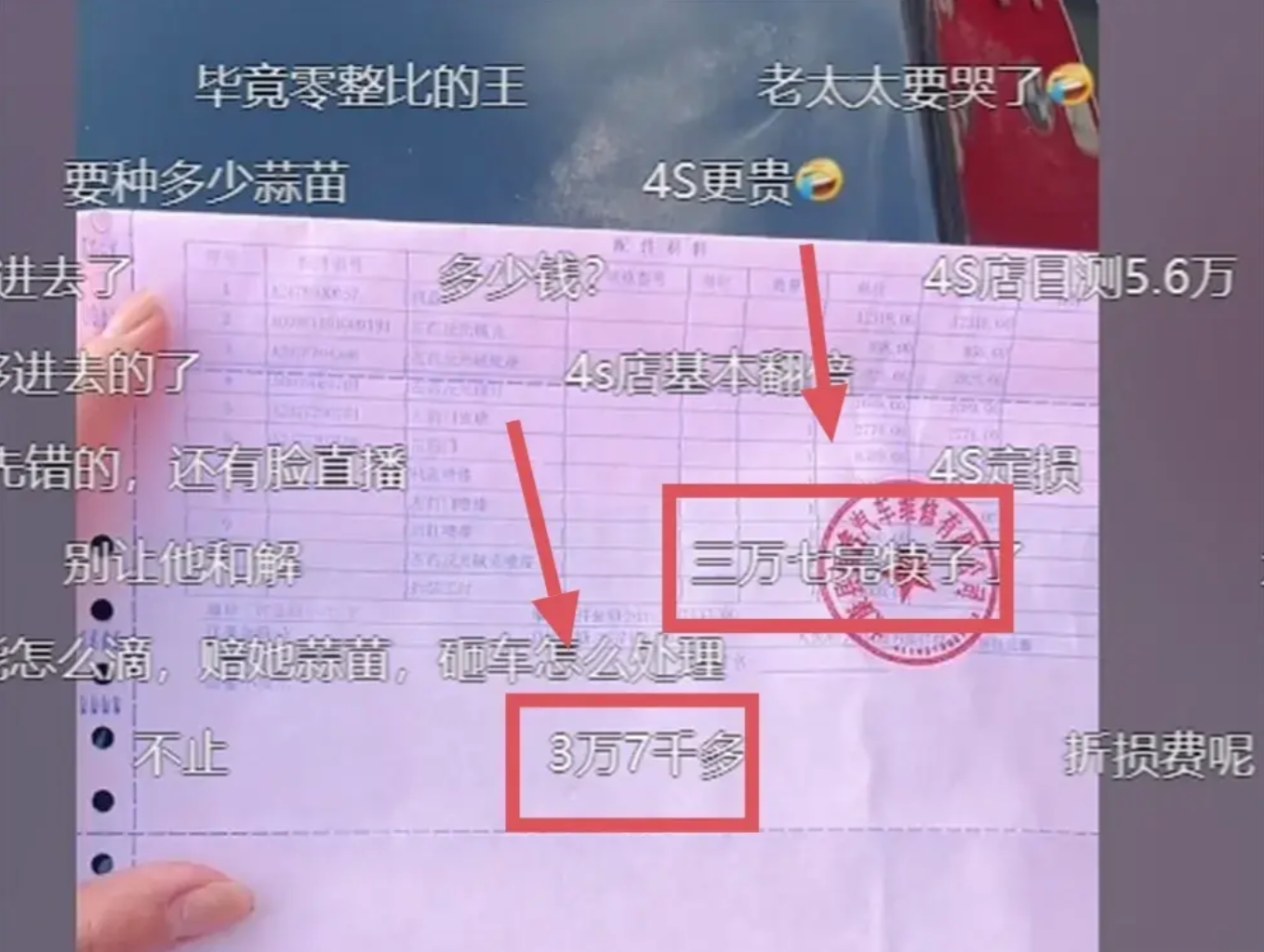 王女士没有受到这些言论的影响,在社交平台上展示了自己到4s店出具的定损单据,上面赫然写着3万7千元。