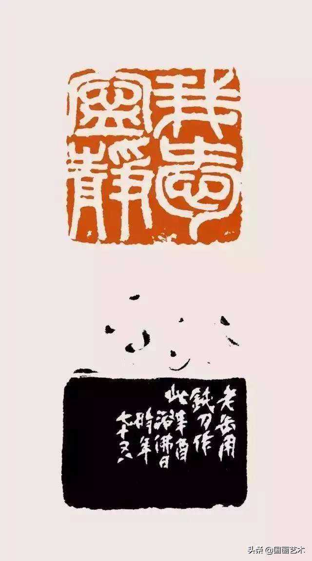 吴昌硕篆刻善于巧夺天工,在传统的冲、切刀法的基础上,辅之以敲、击、凿、磨或借用砂石、鞋底、钉头等,极大地丰富了篆刻艺术的表现手法,并创造性地将篆刻艺术中刀石效果产生的金石味,上升到残缺美的审美新境界。