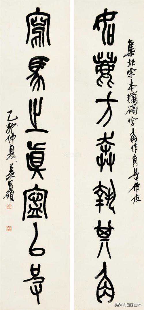 吴昌硕书法作品,以篆书、行草为主,晚年所书隶书,结体变长,取纵势,用笔雄浑、饱满,具有篆书痕迹,将篆、隶溶为一体,形成独特面貌。