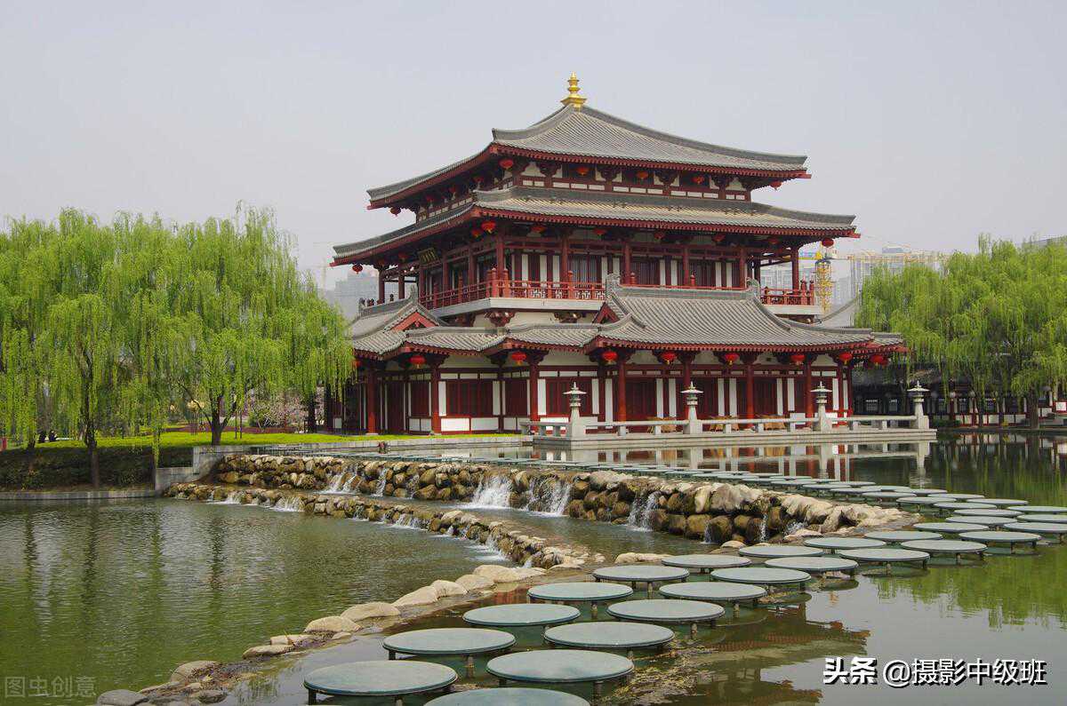 下面这张照片(图七),不仅有主体建筑,还有左右两侧的绿树茵茵,前景也有流水、小桥。元素丰富,却不显杂乱。