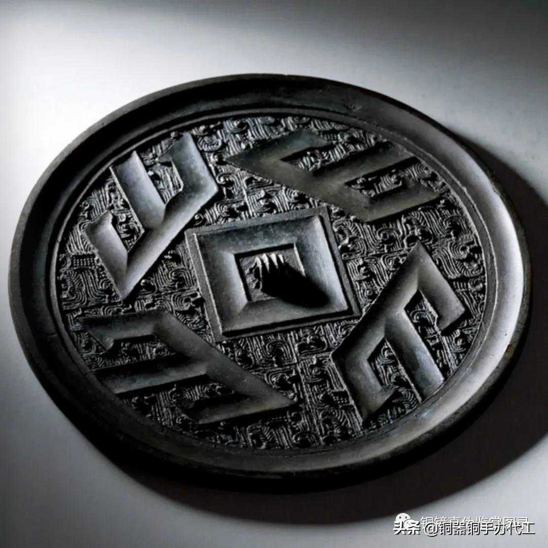 镜黑漆古,羽状底纹层次分明,疏密得当。三山镜存世量极少,有修。