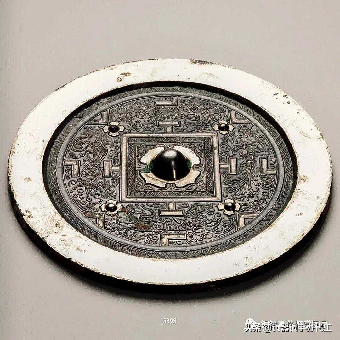 镜版工细致,三弦钮,满饰云雷底纹,浮雕三组变形勾连的凤鸟纹饰,工艺精湛,惜裂修。