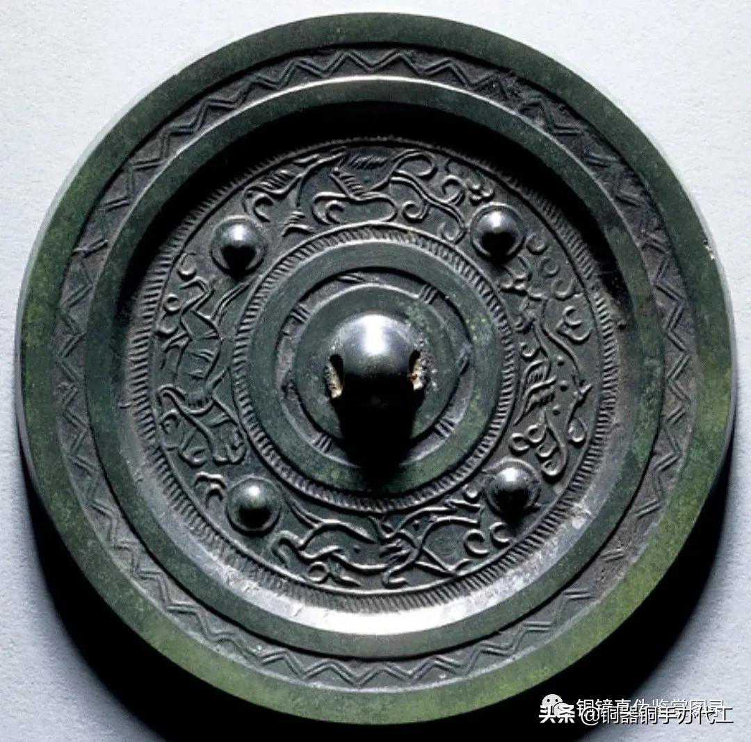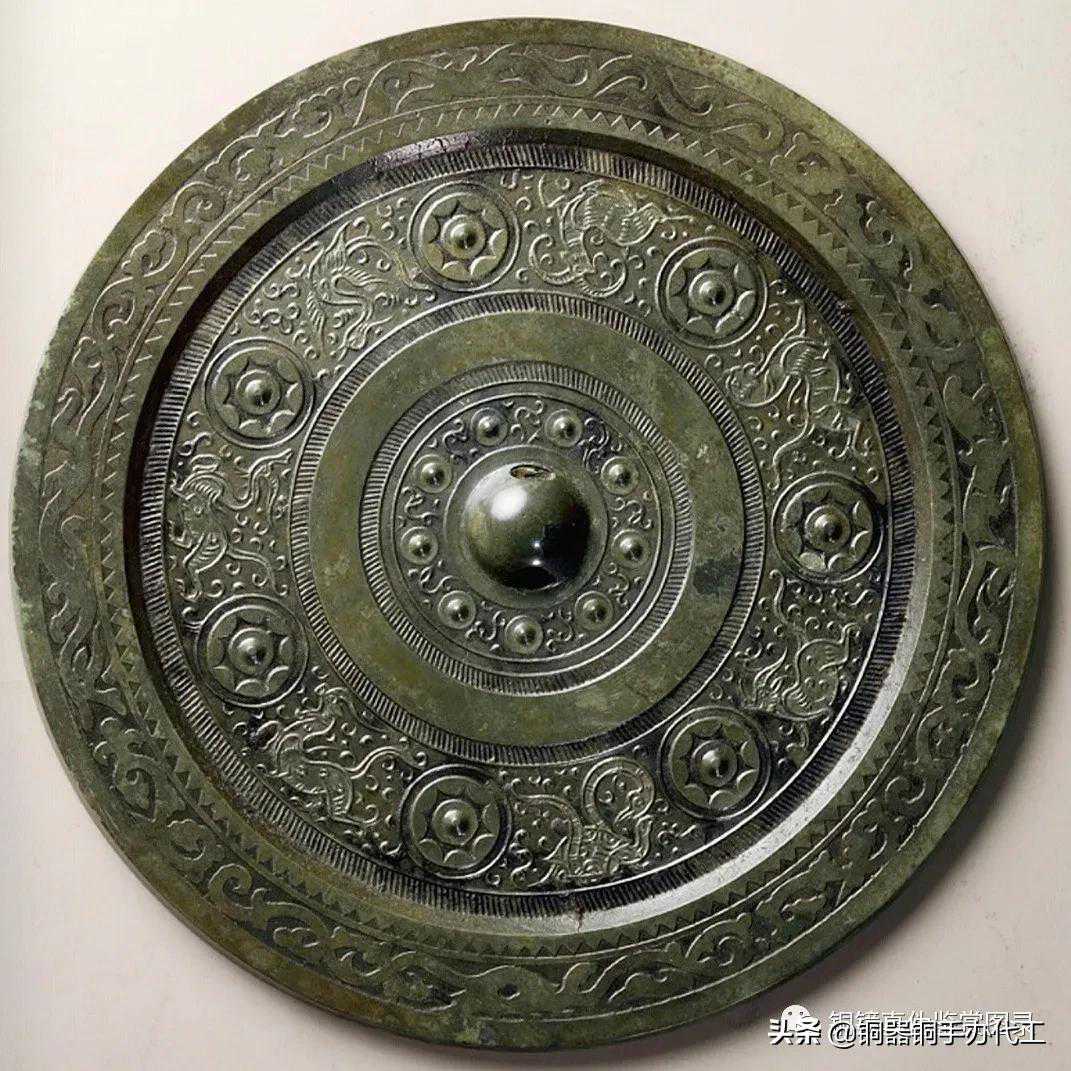 镜图案华丽,工艺精美,黄绿色皮壳,尺寸较大,品相完美。主纹饰为七枚内连弧纹座乳钉相间朱雀、山羊、白虎、青龙、瑞兽、玄武等纹饰。镜缘纹少见,用粗线描绘一周瑞兽纹饰。此镜品相一流,声音清脆,历经岁月而如此品相者,极为罕见。
