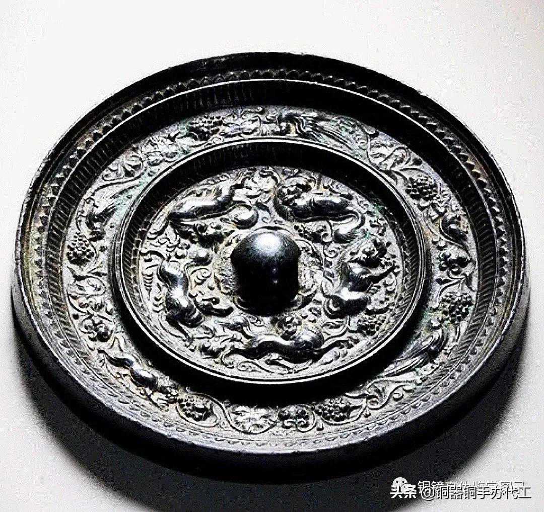 镜光气甚佳,尺寸大而厚重,有修。双弦纹高圈将镜背分为内外二区,内区高浮雕八只在葡萄叶蔓之间嬉戏的瑞兽,造型似狮,两两相对,环绕镜钮。瑞兽间饰以葡萄枝蔓。弦纹高圈内饰长短两周锯齿纹。外区饰瑞兽、鸾鸟和葡萄枝蔓相间环绕,镜缘处饰缠枝花卉纹。