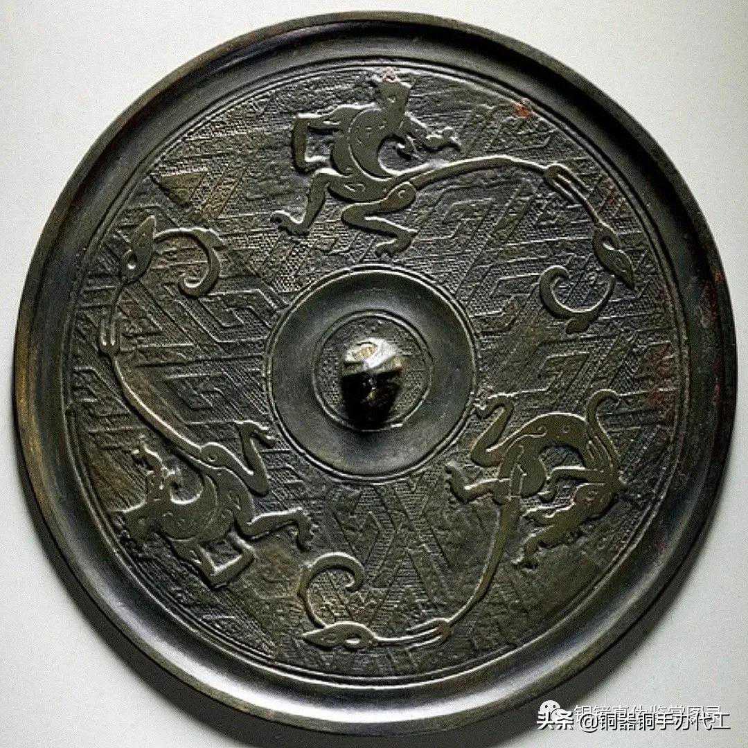 镜版工精美,底纹为菱格形钩连云雷纹,工艺细致缜密,底纹之上环饰三条变形龙纹,三龙单腿独立,龙身卷曲,龙的形象与常见蟠螭纹不同,具象而夸张,造型极富动态美感,冲线。