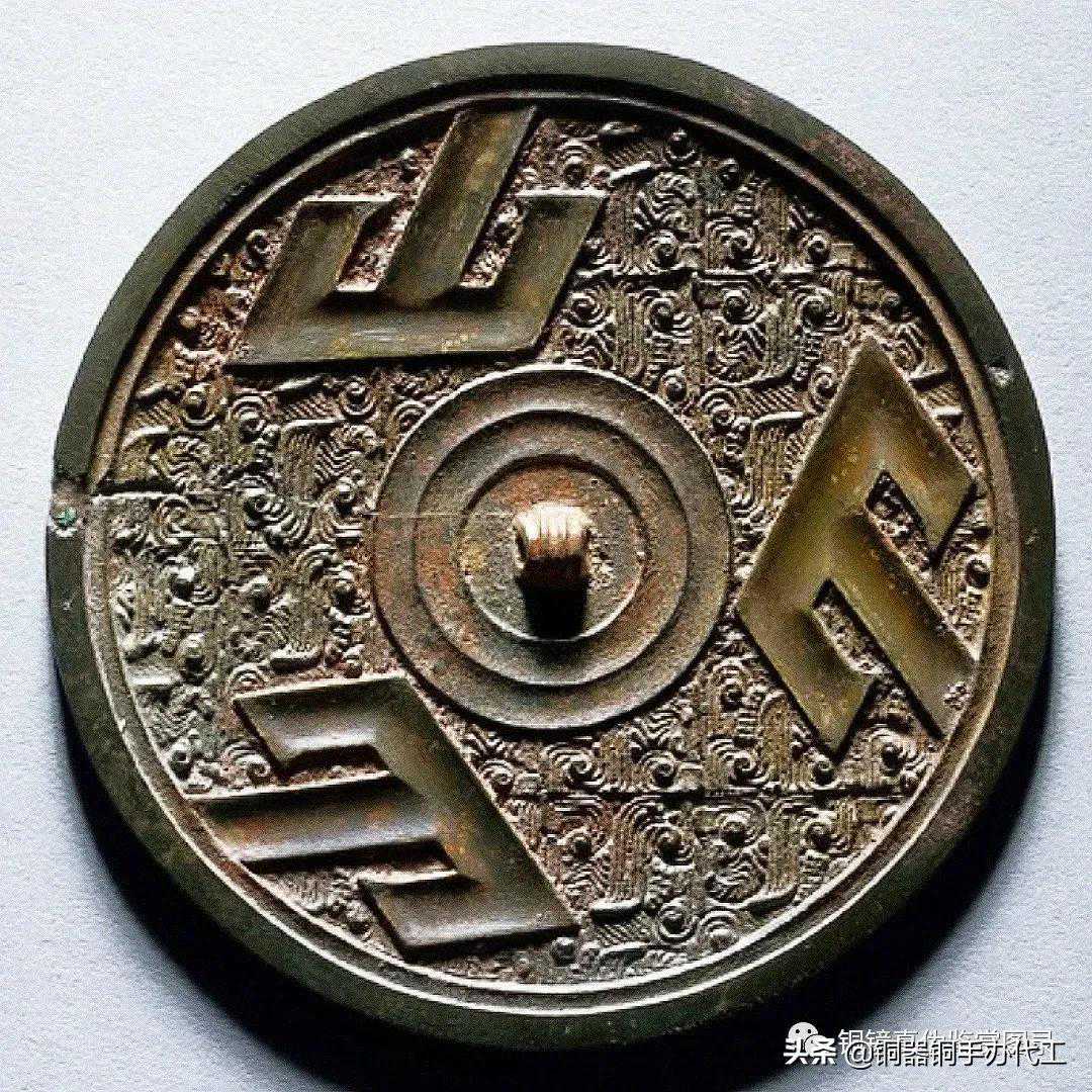 镜光气莹亮,打磨精细,钮外配饰内连弧纹环带,主纹饰为点线结合的几何纹。