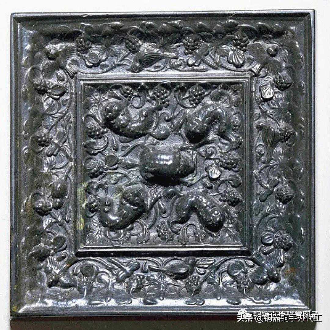 镜工艺精细,通体漆黑,品相极佳。方形,伏兽钮,内区四兽作侧伏卧状,外区雀鸟、蜻蜓、蝴蝶相间环绕,葡萄枝叶蔓铺地,斜立缘。