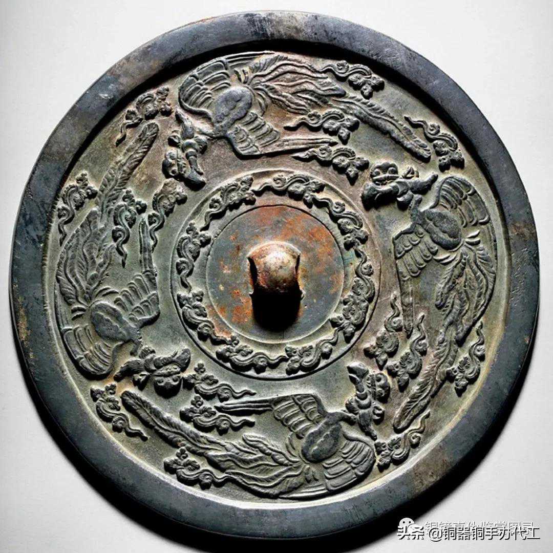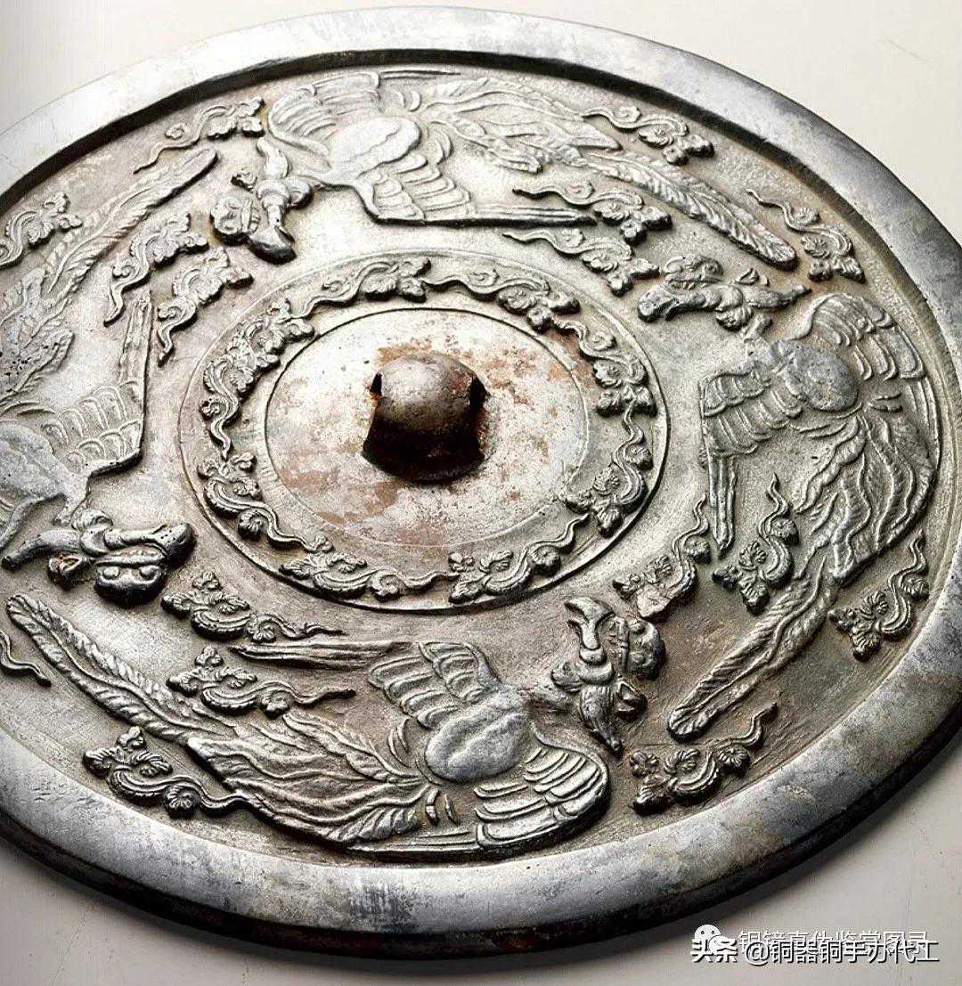 镜尺寸巨大,厚重,铜质白皙,采用高浮雕技法,四只凤鸟铸造精美,刻画细致,气韵生动。勾连的云气纹环饰镜钮,凤鸟巨嘴长尾,展翅飞翔,翎毛细腻,气势恢宏。