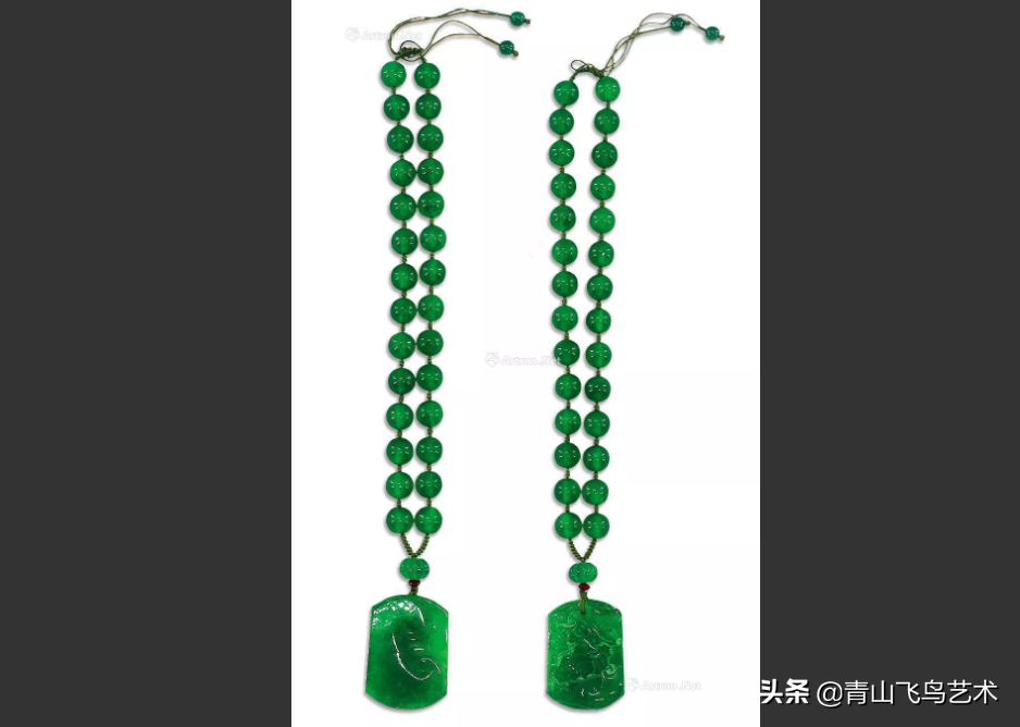 第一、【天然冰种翡翠蛋面钻石项链】翡翠极为鲜艳浓绿,种质通透之无瑕上品,每一颗皆为极高质量翡翠正色蛋面,且全部11颗均为同色同种,蛋面厚圆丰润贵气。18K白金镶造,配以水滴形钻石16颗,及大小圆形钻石。
