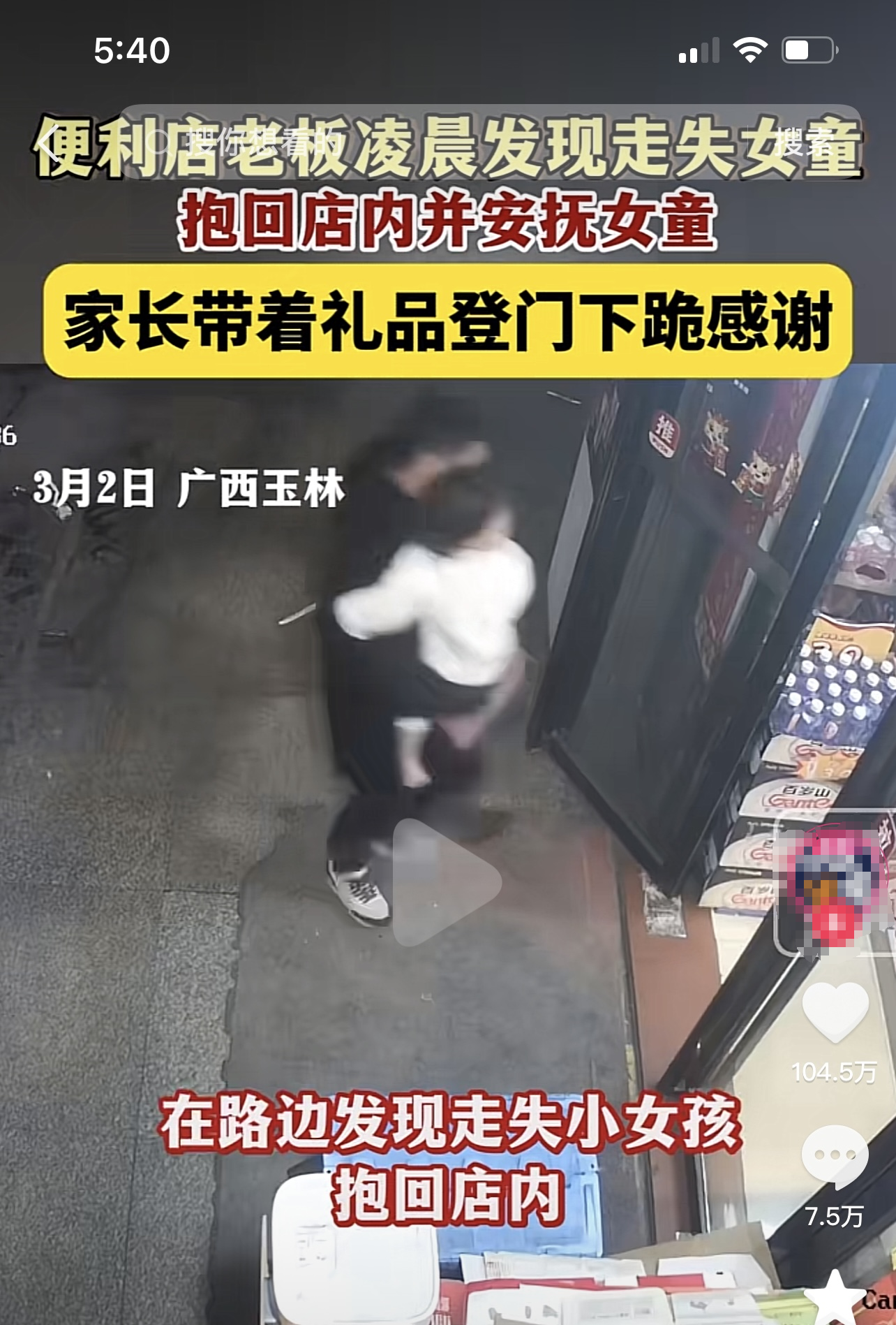 广西的一个便利店老板,在凌晨发现了一个走丢的女孩,找到家长后,没想到父亲竟然下跪感谢老板,那事情究竟是如何的呢?