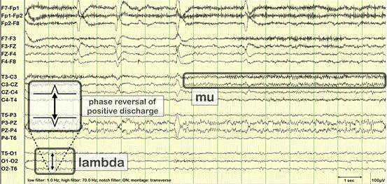 同上图,标注脑电图:λ波(lambdawave):是清醒期出现在枕区的双相或三相尖波,正相成分最突出,但在某些儿童也可表现为负相或双相波形,或正相波与负相波在同一次记录中混合出现。波幅一般不超过50μV,少数可达70~80μV,波底较宽,约为200~300ms,呈倒三角形或锯齿状,散发或连续出现。中央区或Rolandic区μ节律(murhythm):是在清醒安静状态下出现于一侧或双侧中央区(C3、C4)的一种梳状节律,在颅顶区(Cz)最突出,频率在9~11Hz,波幅在30~80μV,其中常混有20Hz左右的快波活动。phasereversalofpositivedischarge:T5-O1和O2-T6导联的波形中存在正反位相倒置现象。