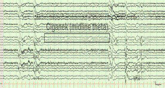 同上图,标注脑电图:中线θ节律(midlinethetarhythm),又称为Ciganek节律。其为中线区(Cz、Pz)为主的4~7Hz,50μV以上的θ节律,呈纺锤形出现,在颅顶区(Cz)最突出,常扩展到双侧旁中线区,持续3秒以上(4~20秒),波形多为正弦样,少数为尖形、弓形或三角形,有时伴有切迹,60%见于青少年。