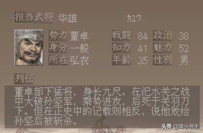 在正史中,华雄不是猛将,只出场一次,身份是都督,被孙坚军斩。