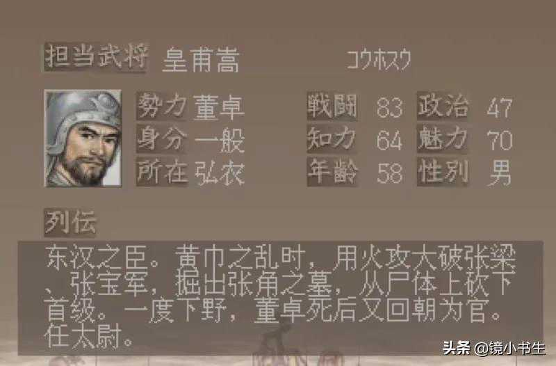 推荐,皇甫嵩,武力值70,统帅值84,谋略值80。