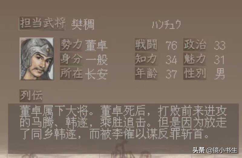 第八,樊稠,武力值76。