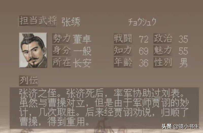 在正史中,张绣是凉州豪杰。196年,张绣占据宛城,多次成功抵抗曹操,最后投降。官渡之战后,因力战有功,封邑2000户。