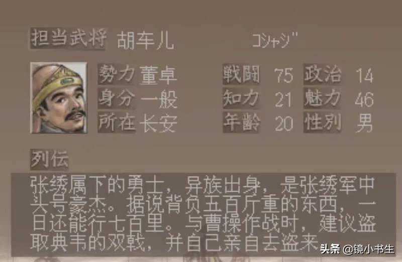 第九,胡车儿,武力值75。
