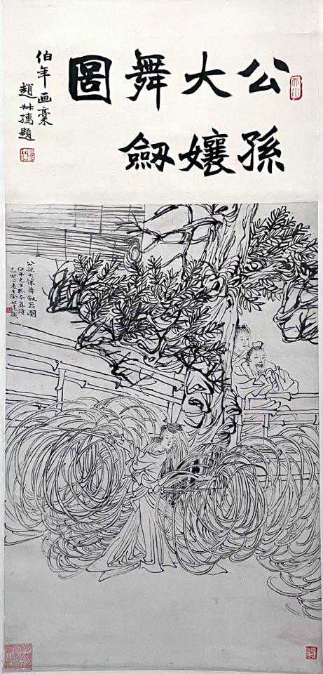 最有意思的是一幅《公孙大娘舞剑图》。据说公孙大娘为开元盛世时第一舞人,以舞剑器被推为盛唐第一,草圣张旭从她的剑法里悟到了草书的精髓,画圣吴道子也通过观赏公孙大娘舞剑来领略用笔之道。实情如何,今已不可考,但看任伯年这幅舞剑图,公孙大娘把两柄白刃舞得宛如柔练,画家不惜画出几百道圈圈,把虚者实之,记录下了剑在空气中飞快划过的所有痕迹,公孙大娘身后的大树枝叶瑟瑟抖动,仿佛感受到了剑气,但公孙大娘本人却岿然不动,表情相当从容,她才是万千变化之中那个不变的核心。