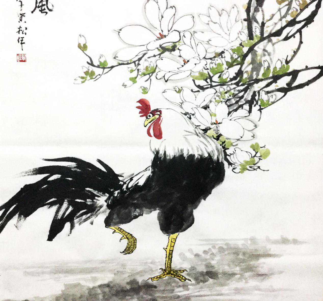 鸡的"文、武、勇、仁、信"五德,代表了人们对道德的追求,也是许多画家喜爱画鸡的原因。徐悲鸿是近现代动物画的高手,他画的鸡,多是昂首挺立、"怒发冲冠"的公鸡,像斗士和高歌的"代言人"。1937年,抗日战争暴发,中华民族正处于危难之时,徐悲鸿曾创作一幅令人精神振奋的《雨中鸡鸣》。
