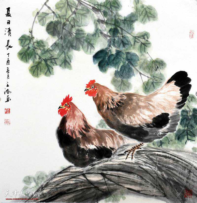 此幅题云今秋翻陈案矣,乃指敌寇投降,画中史料可实也"。这幅《七鸡图》是其所画雏鸡当中的精品。王雪涛是笔者习画风格的偶像,他是现代中国卓有成就的花鸟画大家,对我国小写意花鸟绘画作出了突出贡献。王雪涛喜欢画公鸡或公鸡母鸡组合,很少画雏鸡。其作品构思精巧,形似神俏,鲜活多姿,情趣盎然,生动可爱,富有笔墨情趣。他既善于描绘鸡世界的丰富多彩和活泼生气,又精于表现画家的心灵感受和动人想象,在情景交融中体现出转瞬即逝的情趣,非常传神并独到地表现了雄鸡的气势和母鸡的慈爱。