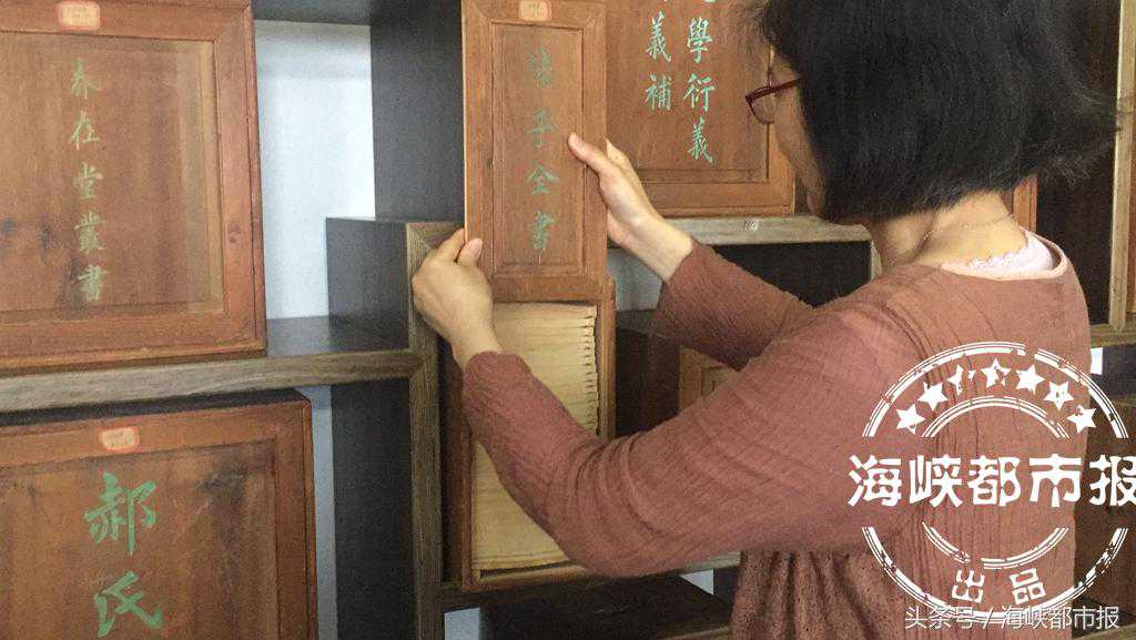 陈列室里成套的古籍都配有专门的书箱,“这些木箱是过去豪门大户书香人家为保护图书,按照书籍的尺寸、册数用上好的樟木定制的,可以防虫防尘,可说是为图书量身定制的。不少书籍钤有藏书章‘三山陈氏居敬堂藏书’‘螺洲陈氏赐书楼藏书’‘闽县陈氏赐书楼藏善本图书’,这是陈家藏书的标识。”