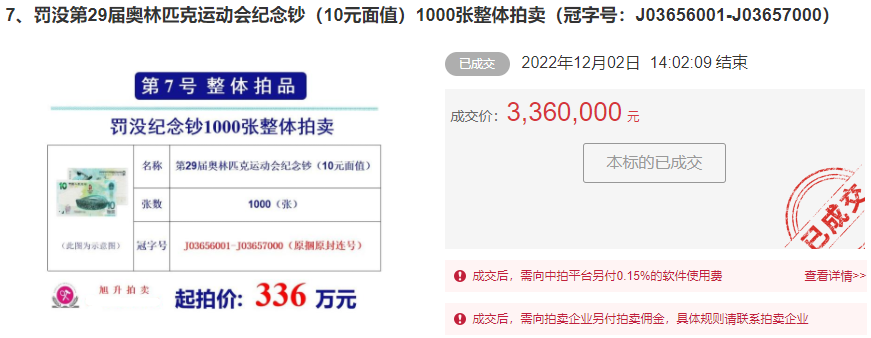 1万张奥运钞结果如何?在12月2日的罚没专场中,10捆奥运钞最多细分到了整刀。先拍整捆,流拍后再细分为10刀拍卖,10捆的总起拍价是3360万,折算单张是3360元起拍。