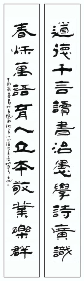 “姚体隶书”的结体宗法汉碑,尤得力于石门。书作乍看方正无奇,细观稳中寓奇,奇险丛生。横细竖粗,冲击视觉;时现飞白,韵律感强;既中宫内聚,又放逸开张;轻重相间,节奏明快。竖画排列取二王之内敛向背,鲁公之宽博相向兼具,是两大系统的融合,别开新面,独步古今。“姚体隶书”的“奇”还奇在“造险”与“破险”的有机统一,静稳中求奇险,既得奇险,复归平正。孙伯翔先生称小尧先生书作:“绚烂之极,复归平淡”,也大略指此也。