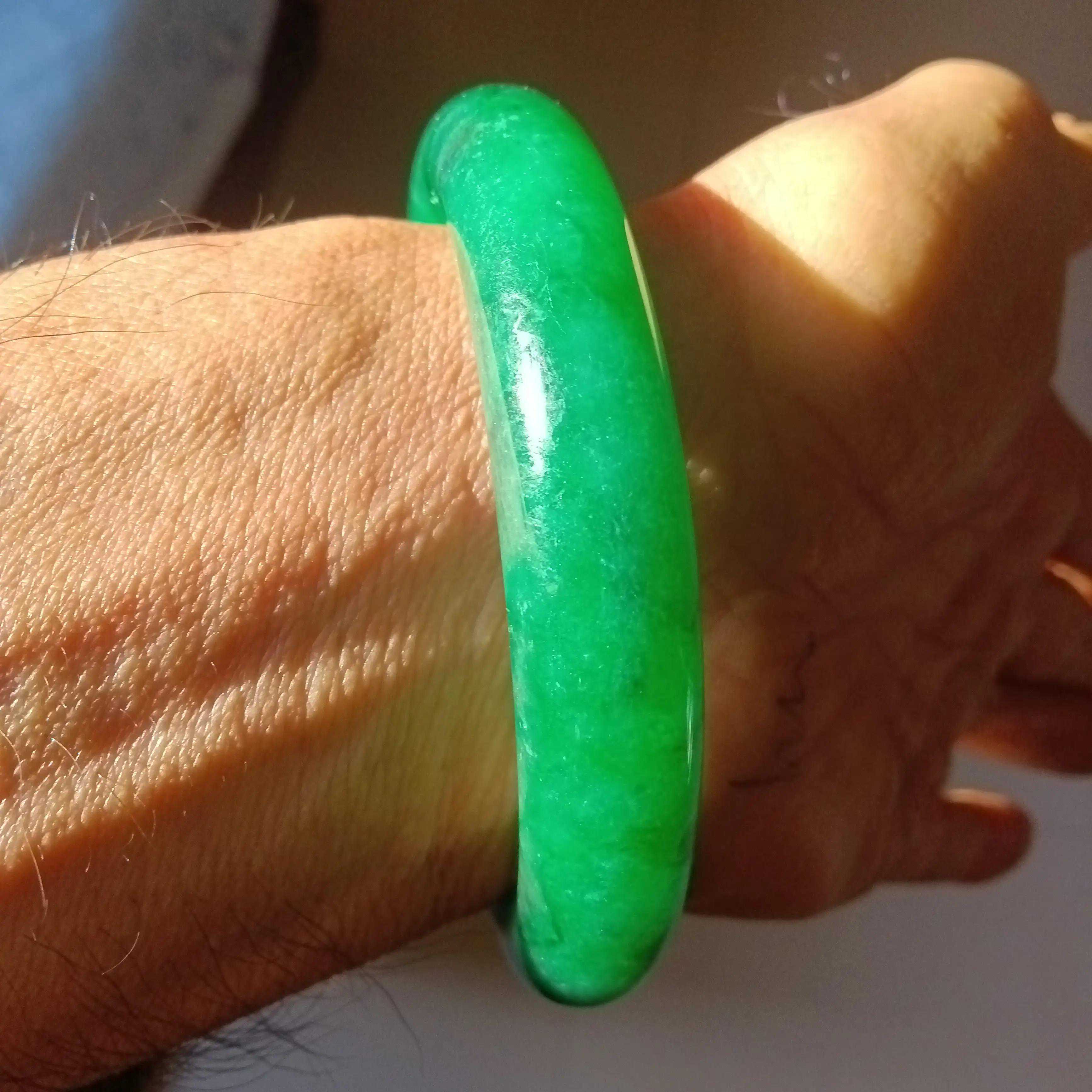 云南收藏,清代老坑玻璃种帝王绿翡镯子,从表面的颜色来看,深绿色,有油质感的玻璃光泽,应该就是清代老坑玻璃种帝王绿翡翠。