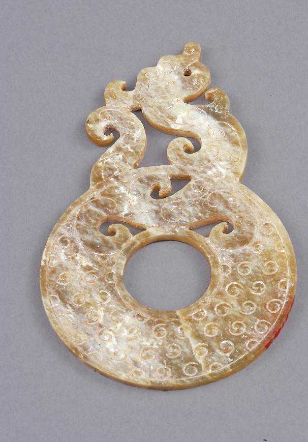 甘肃省博物馆藏的汉代镂雕龙纹璧,龙昂首,躯体屈曲,尾部上卷贴于首后,有腾空而起之势。龙形玉器表现了古人将龙融入礼器之中,希望借此上达天庭,得到神灵与祖先的庇佑。