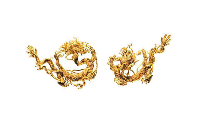 甘肃省博物馆藏的明代累丝金龙,龙首耸额巨目,鬣发飞扬,神情凶猛;龙足屈伸相应,利爪如钩;龙身似盘似舒,蜿蜒多态;龙尾分叉,形状如叶,轻轻摆动,飘带般长须刻画出金龙潇洒自由的雄姿。
