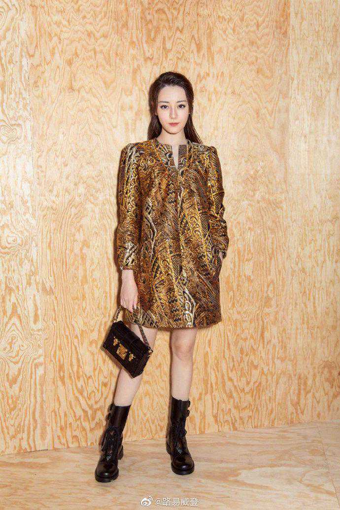 迪丽热巴现身路易威登2020春夏女装秀现场,一身金色兽纹Look贵气逼人。图/LouisVuitton官方微博截图