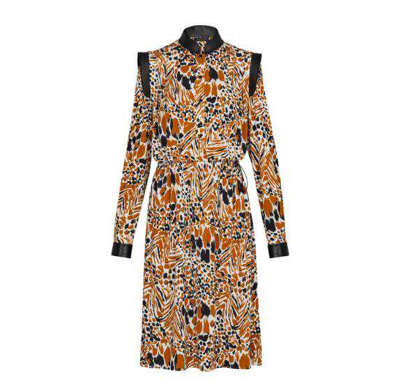通身兽纹印花的服装,如连衣裙、大衣等单品,搭配时要注意收敛低调。因为兽纹本身就已经足够抢眼,其它配饰若还走夸张吸睛风格,就会过犹不及,反显繁冗。